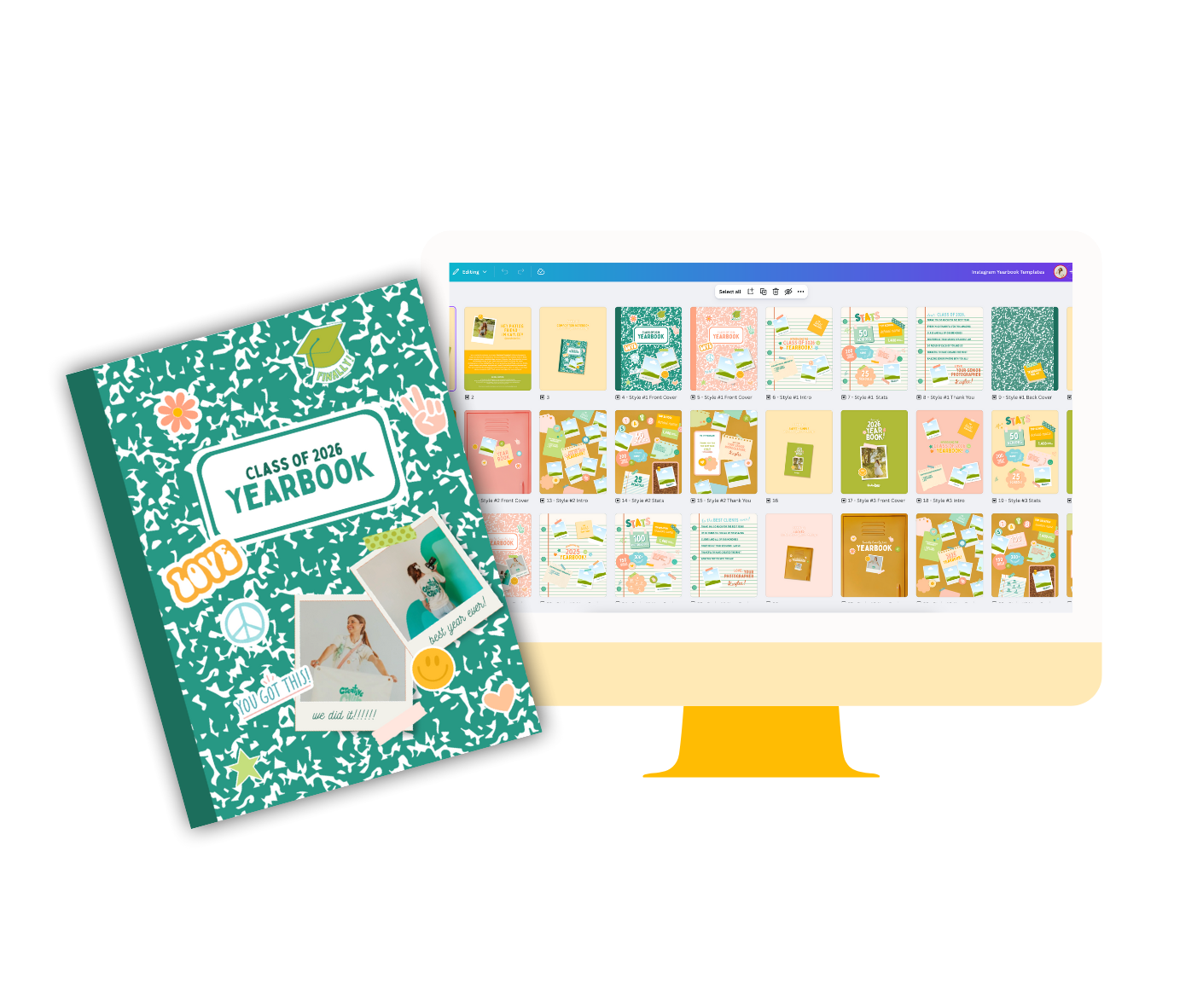 The Yearbook Template: 3 different styles (composition notebook, locker, and sweet + simple) that come in two different versions (calendar year recap + school year recap) Ready for you to start designing instantly! Gather your favorite photo of each client, adjust the stats information, and you’re ready to post!!!